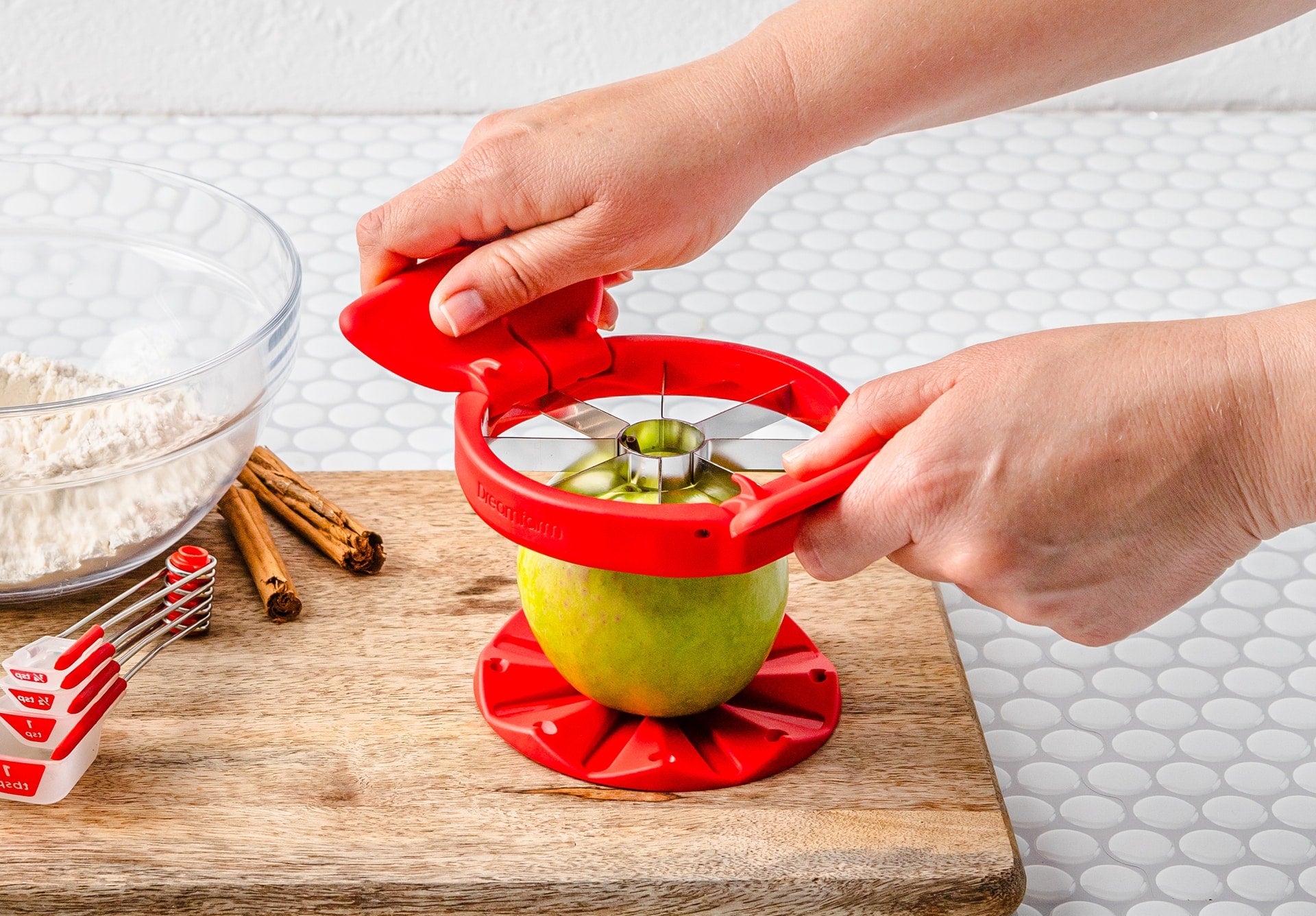 Flapple is an ultra-sharp apple slicer and corer that folds flat for compact storage. Flapple’s raised handles fold flat for compact and space-saving storage. Auto-aligning base ensures complete cuts without a cutting board, then locks together with folded handles to cover blades for safe storage. Wide diameter cutter divides all sizes of apples into 8 equal pieces and removes their core. Double-reinforced Japanese stainless steel provides an ultra-sharp and durable blade.