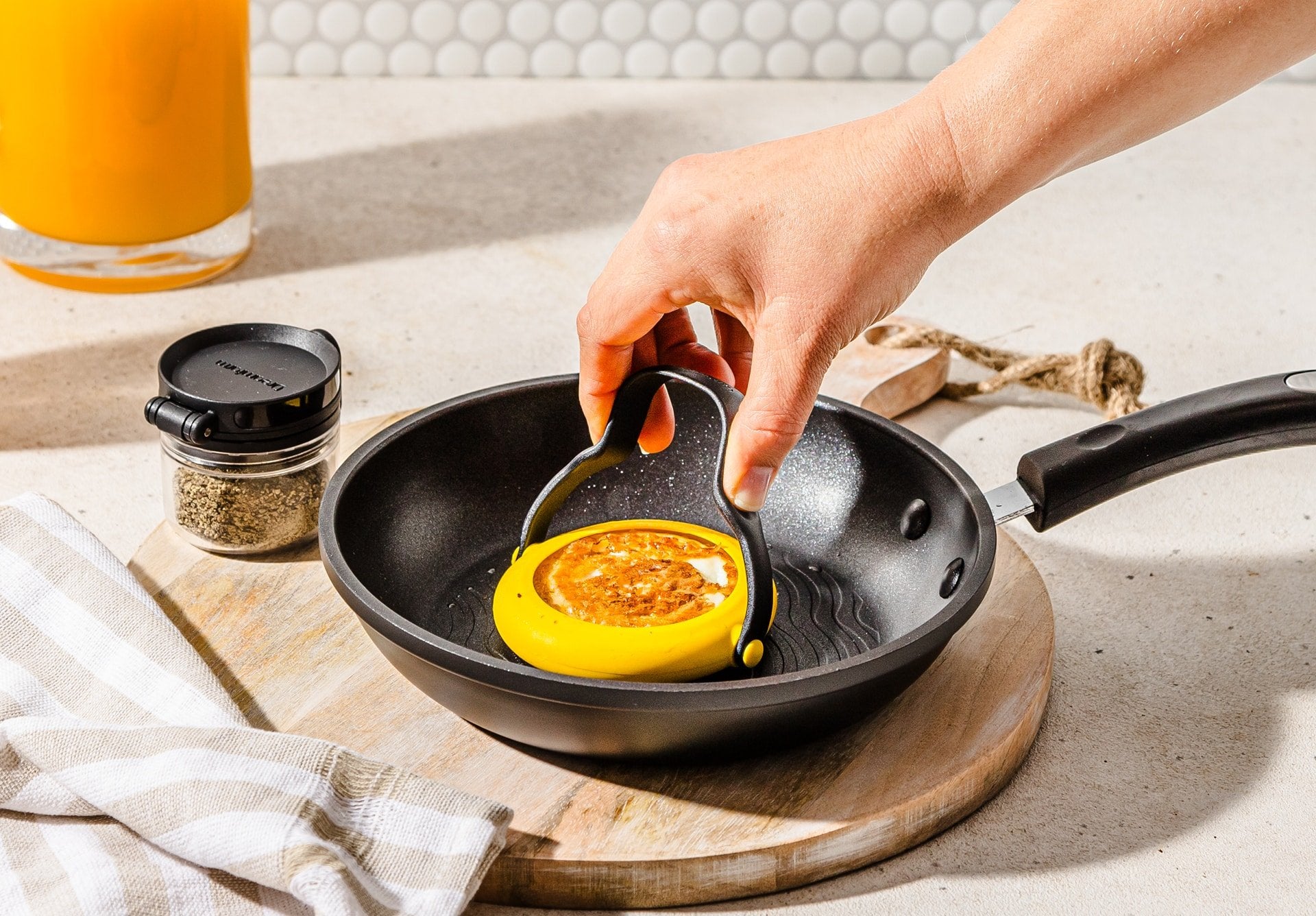 Flegg is a set of 2 no-leak egg rings that flip, lift, and serve.