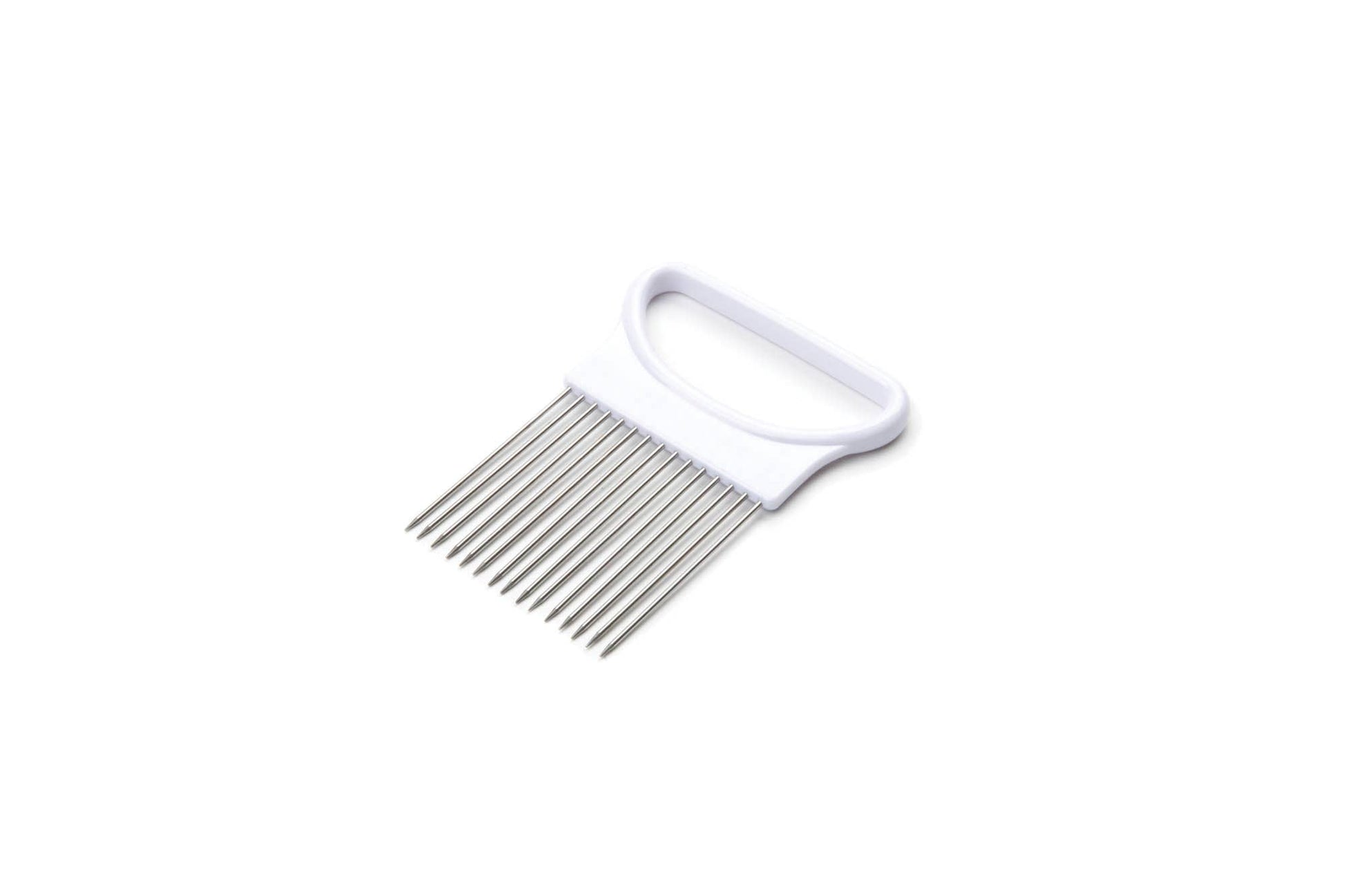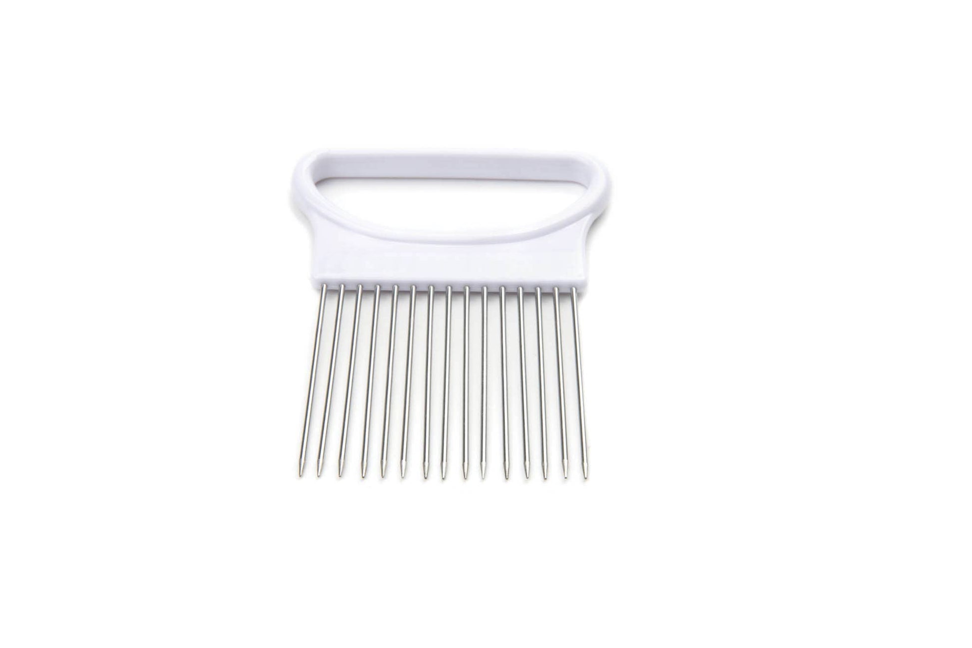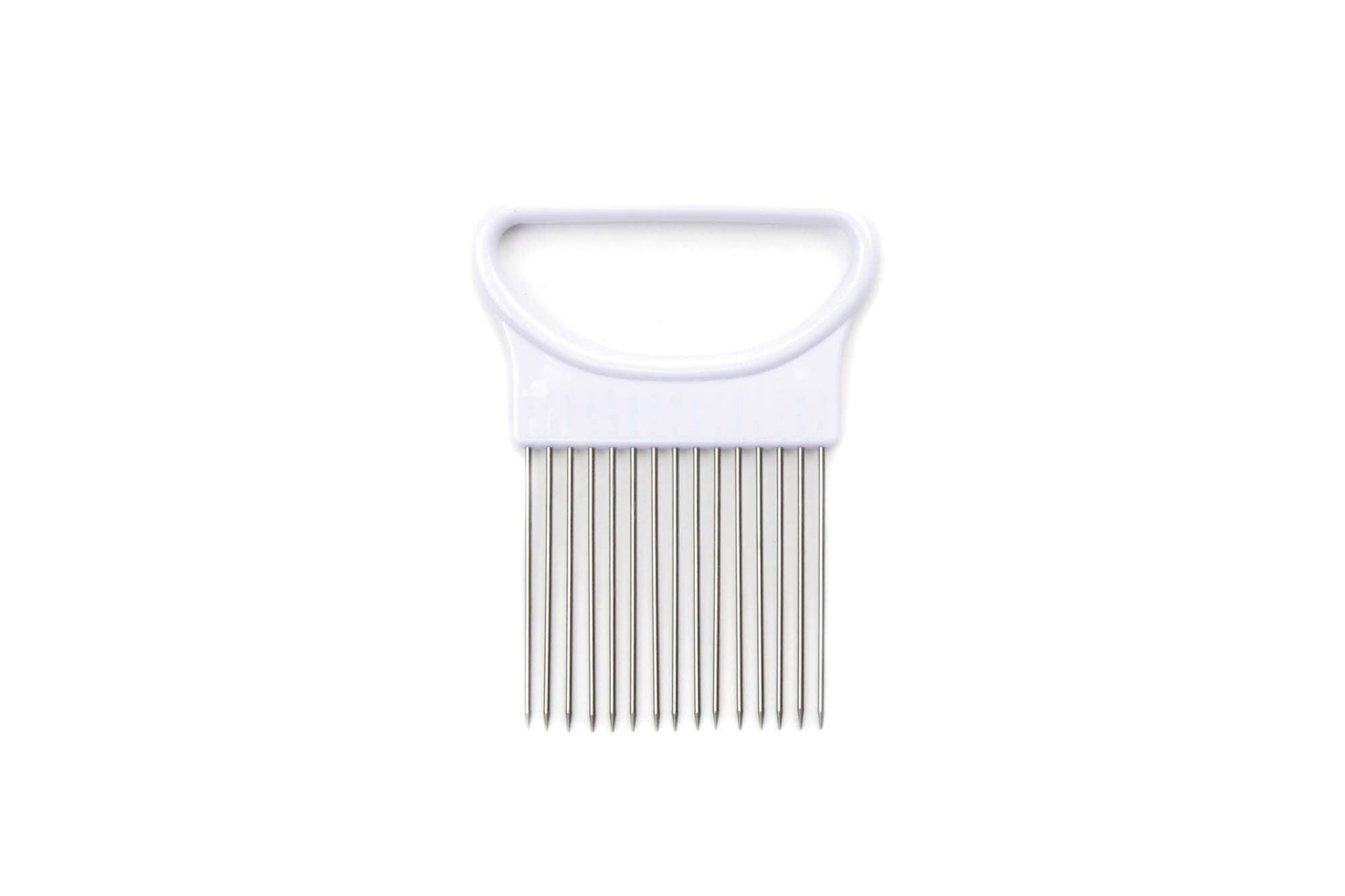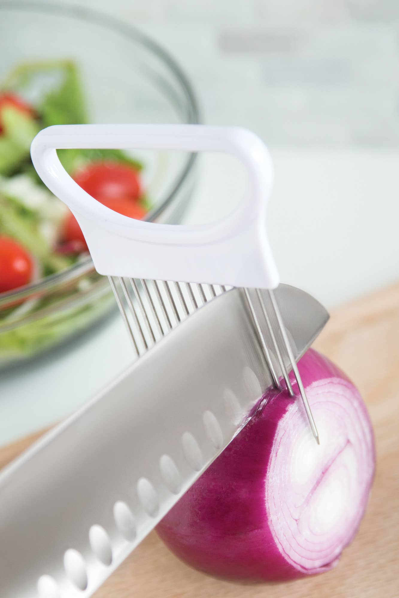Love cooking with onions, but hate your hands smelling like them? Utilize this handy Onion Holder to safely slice your veggies. The stainless steel picks will hold the onion in place for easy, quick and even slicing! The durable plastic handle provides a non-slip grip for a secure holding and will keep your fingers away from food odor. Chop smart!Package Type: Blister Card