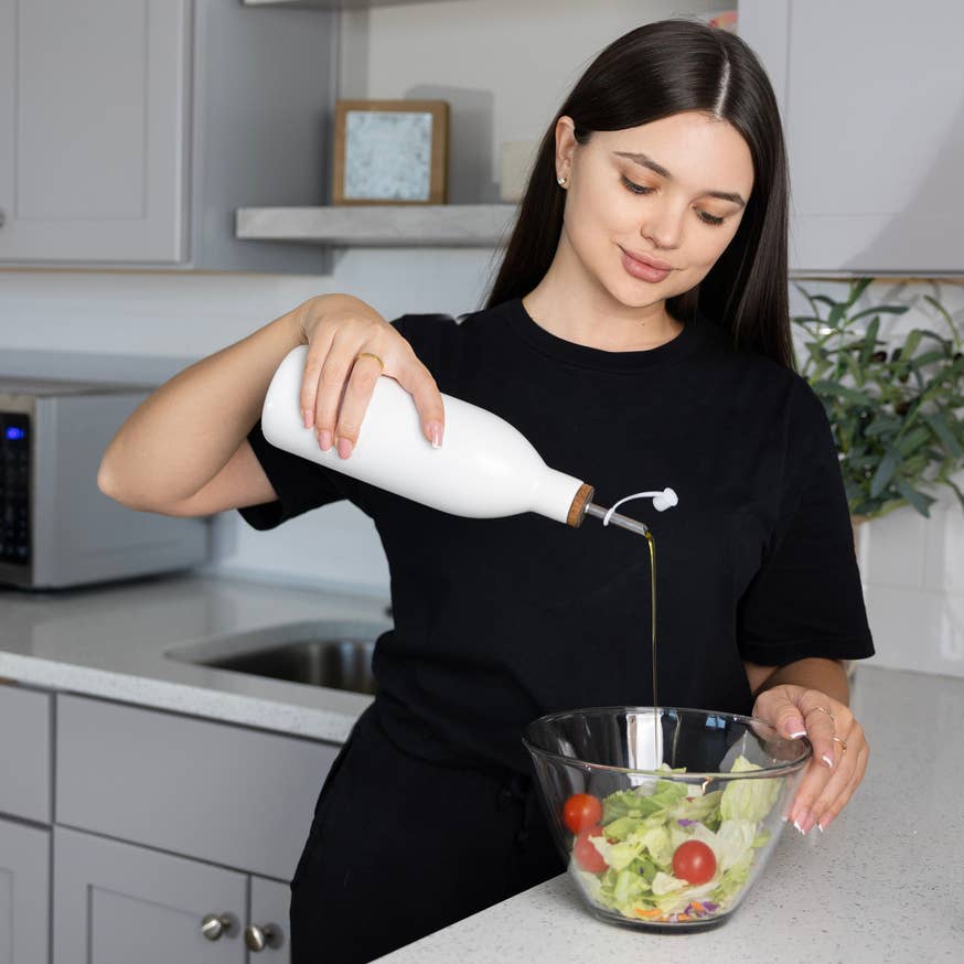 -EASY POURING: The long spout of the ceramic oil can allows you to effortlessly pour oil into salads, pans, bread trays and more!