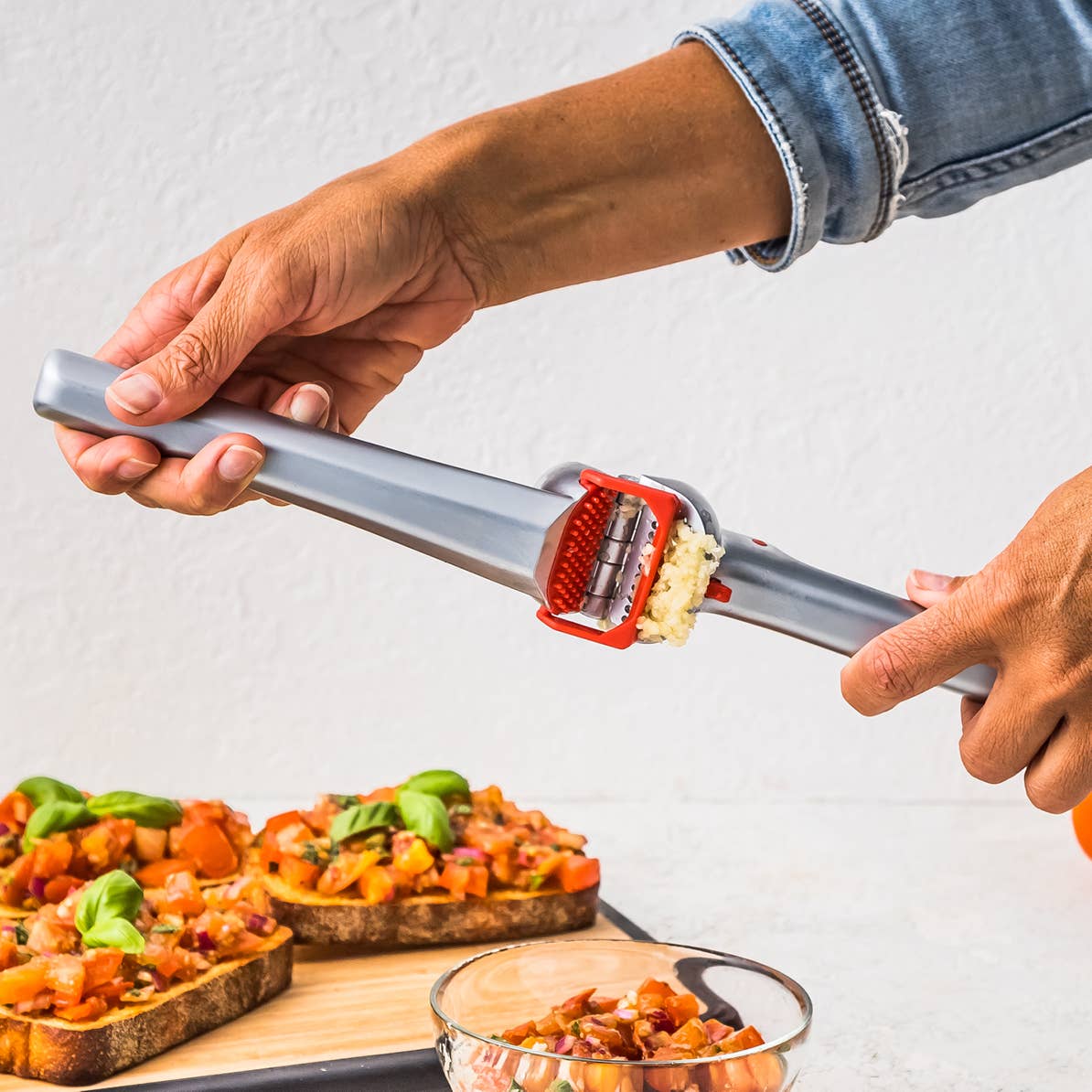 Garject is one powerful garlic press. It easily and completely presses multiple cloves of garlic at once, without the need to peel them first.